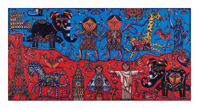 Por otro lado, el arte de Andriacci se configura como un atlas de la flora, la fauna, el mito y la materia oaxaqueños. En Pareja de elefantes o Conviviendo en armonía, el protagonismo abandona su eje antropocéntrico y vemos a un par de elefantes preñados de seres humanos. Sus figuras, de resonancia cubista, son multifacéticas: cada una funciona como un espejo que contiene a otro espejo, en una secuencia infinita de reflejos. Todos los elementos que utiliza son extraídos, recompuestos y devueltos en capas de significado que dialogan entre sí dentro de cada personaje, de cada composición. El cocodrilo, el elefante, la libélula o la rana encuentran su lugar en su ecología cósmica de símbolos, donde la materia y el mito se confunden en una misma vibración.
