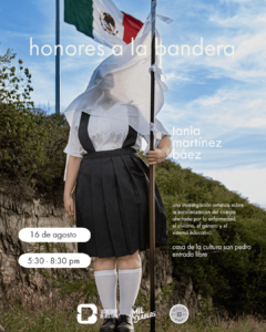 ¿Cuándo la artista Tania cuestionó a la niña abanderada? ¿Quién impuso esta memoria que nos une? En 1981, el entonces presidente, José López Portillo, oficializó los lunes de los honores a la bandera en las escuelas de educación básica públicas y privadas. Con uniformes impecables y escoltas blancas instituidas por los mejores alumnos, aprendimos a competir por ser la y el abanderado. El orgullo con sonido marcial marcando la disciplina escolar como una preparación a la escolarización de la existencia. Y ahí, entre cánticos de céfiros y trinos, Tania Martínez Báez, de una manera casi instintiva, fue moldeando su disidencia, prueba de ello es Honores a la bandera un proyecto vivo y abierto que, desde 2023 con la exposición colectiva curada por Eliud Nava ONCE85. Parte 2. Contenedores, empezó a tomar volumen en piezas realizadas en distintas técnicas que han ido integrando una posología visual para curarnos de esa escolarización de la existencia impuesta por el statu quo que nos exige la asepsia como única posibilidad.