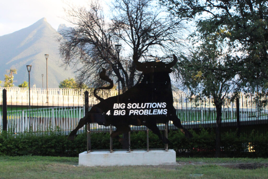En ese camino, irrumpe un espectacular publicitario con la silueta de un toro que nos hace sentir en una película de Carlos Saura; se trata de Big Solutions 4 Big Problems, de Andy Medina (Oaxaca, 1993), cuya intención es parodiar, tal como se explica en la cédula: “la publicidad corporativa y las inciertas promesas de solución frente a las crisis contemporáneas”, porque esta escultura no vende nada más que ilusiones ya agotadas. Esta monumentalidad contrasta con la delicadeza de Ring of Iron, Ring of Wool, de Bárbara Sánchez-Kane (Mérida, 1987), que se mimetiza al entorno vegetal de Fundidora, un gesto textil que abraza a un árbol, del cual pende una cuerda de bronce generando una tensión entre lo que natural y lo industrial, que imperceptiblemente se filtra en la mirada. Al contrario de la pieza de Paloma Contreras Lomas (CDMX, 1991): No le haga caso a Lenin: los tres procesos y las casi muertes del Tenebras, una cabina de video que llama al paseante a espiar una realidad paralela construida de recuerdos que subrayan el abandono de un rumbo citadino, donde alguna vez –en un pasado inmediato– se vivió la noche marginal masacrada porque aún antes de la guerra contra el narcotráfico su destino estaba marcado. Un palimpsesto visual que narra una ficción ciberpunk con sentido del humor, en la que suceden los múltiples Monterrey (incluso el guerrillero, el producto de la violencia económica, el efecto del despojo, el de los migrantes…) que se reinventan una y otra vez sobre las ruinas de otras ruinas, de otras ruinas.