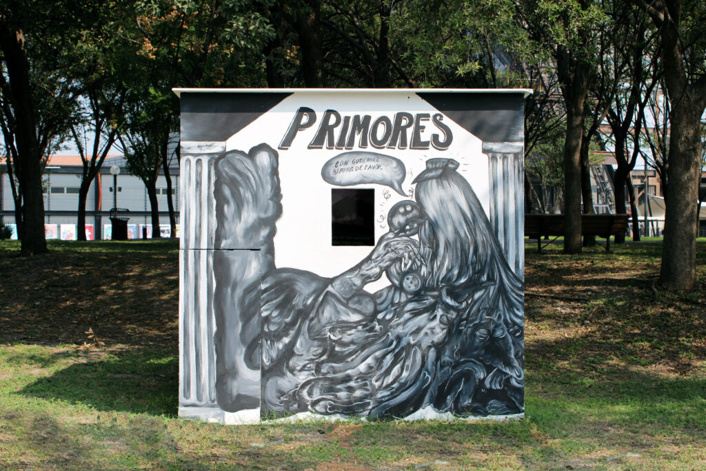 En esta línea de la nostalgia de un futuro no vivido, pero como un conducto de la crítica, está la pieza Carolina Herrera I♡ NY de la dupla ASMA –Matías Armendaris (Ecuador, 1990) y Hanya Beliá (México, 1994). Se trata un ciempiés-prisma rectangular lleno de desechos encontrados que subrayan la voracidad de un consumo que transforma cada vez más rápido a cualquier objetos en basura, como esos llaveros-suvenires desechados al término de las vacaciones. Entre esos desechos están también nuestras emociones que se integran a este ciempiés que pareciera caminar lentamente por el parque.
