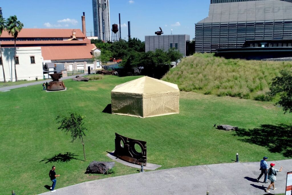 Las siete piezas irrumpen el paseo por Parque Fundidora con su halo distópico y nos abren la puerta para entrar a ficciones críticas del presente que nos invitan a imaginar el futuro. Un mañana consecuencia de las contradicciones en nuestras acciones, de consumismo salvaje, del individualismo rampante, pero también efecto de reflexiones que ya en este presente-pasado asumía la interconexión entre las decisiones humanas y los eventos naturales. En este sentido, las obras son férreas porque la metáfora no alivia el dolor de las repercusiones ni de los afectados y, sin embargo, el espectador logra maravillarse por las formas en la que las y los artistas narran sus pensamientos y sentires; y tras rodearlas –como en el caso Refugio, de Miguel Fernández de Castro (Hermosillo, 1986)– o habitarlas –como en Nostalgia del agua, de Chavis Mármol (CDMX, 1982)–, sentirse protagonistas. La primera traslada al presente regio las carpas improvisadas que parecen brotar, en el desierto del Altar, en Sonora, como “oasis” fallidos para los migrantes que buscan protegerse del sol, de maleantes y de la autoridad. Duele observar esta estructura más parecida a una yurta edificada con el material que esos hombres y mujeres usan para no dejar huella en el desierto. Duele imaginar su escala en la vastedad, tan mínima como las esperanzas de esos que ansían refugio. Sin acceso al interior, la pieza de Miguel queda suspendida, como describe el curador “entre utilidad y abandono, como testimonio de una arquitectura provisional marcada por la urgencia”. La segunda –una fuente seca– se integra a la cotidianidad, los visitantes al parque se sientan para tomar un descanso con tal certeza que su presencia es parte de la normalidad, tal como lo es la escasez de agua; sin embargo, poco a poco el ocupante entiende que está sobre una ruina que evoca otros tiempos donde el agua corría por este hoy deseo.