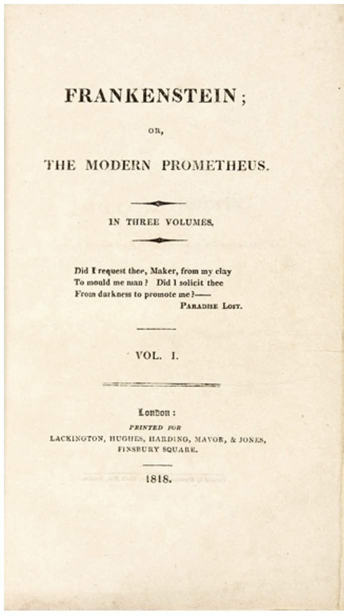 [2] Shelley luego agregó dos marcos narrativos adicionales al manuscrito, por lo que ahora estas frases abren el Capítulo IV de la novela: “It was on a dreary night of November, that I beheld the accomplishment of my toils. With an anxiety that almost amounted to agony, I collected the instruments of life around me, that I might infuse a spark of being into the lifeless thing that lay at my feet. It was already one in the morning; the rain pattered dismally against the panes, and my candle was nearly burnt out, when, by the glimmer of the half-extinguished light, I saw the dull yellow eye of the creature open; it breathed hard, and a convulsive motion agitated its limbs.” Mary Shelley, Frankenstein: The 1818 Text, Nueva York: Penguin, 2018, 43.