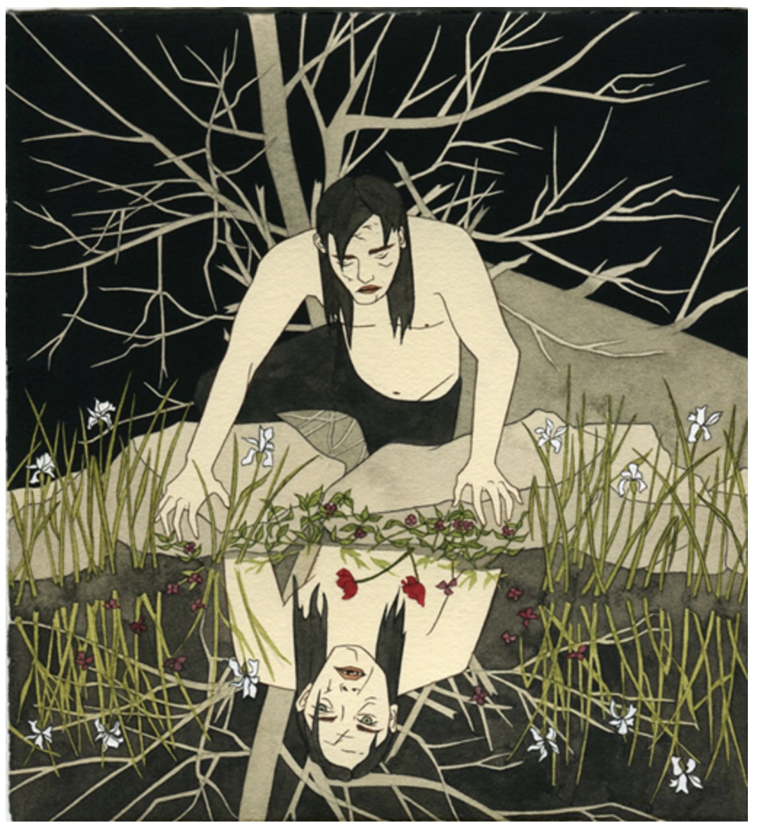A diferencia de Narciso, descrito por Ovidio como un ser tan hermoso que se enamoró perdidamente de su propio reflejo en un estanque, el rasgo físico gobernante de la criatura que nace de la imaginación de Shelley es de extrema fealdad. Es por eso que, en lugar de celebrar el éxito de su experimento, su creador huye despavorido. Como si fuera el polo contrario de un imán, en lugar de atraer a otros seres, el semblante de la criatura los rechaza de manera contundente. Lo describe el propio Frankenstein como más horroroso que una momia reanimada y más terrible que cualquier figura de la imaginación de Dante. En cuanto a la creatura, ella misma se aterra al verse en el reflejo de la superficie del agua de un estanque transparente cerca de la cabaña de los De Lacey: “… cuando me convencí plenamente de que era en realidad el monstruo que soy, me llenaron las sensaciones más amargas de desaliento y mortificación”.[4] En lugar de abandonarse en la contemplación de su reflejo, como Narciso, la creatura es abandonada hasta por su creador –siendo el abandono, para mí, el tema central de todos los que aparecen en la obra, o cuando menos el que más me conmueve.