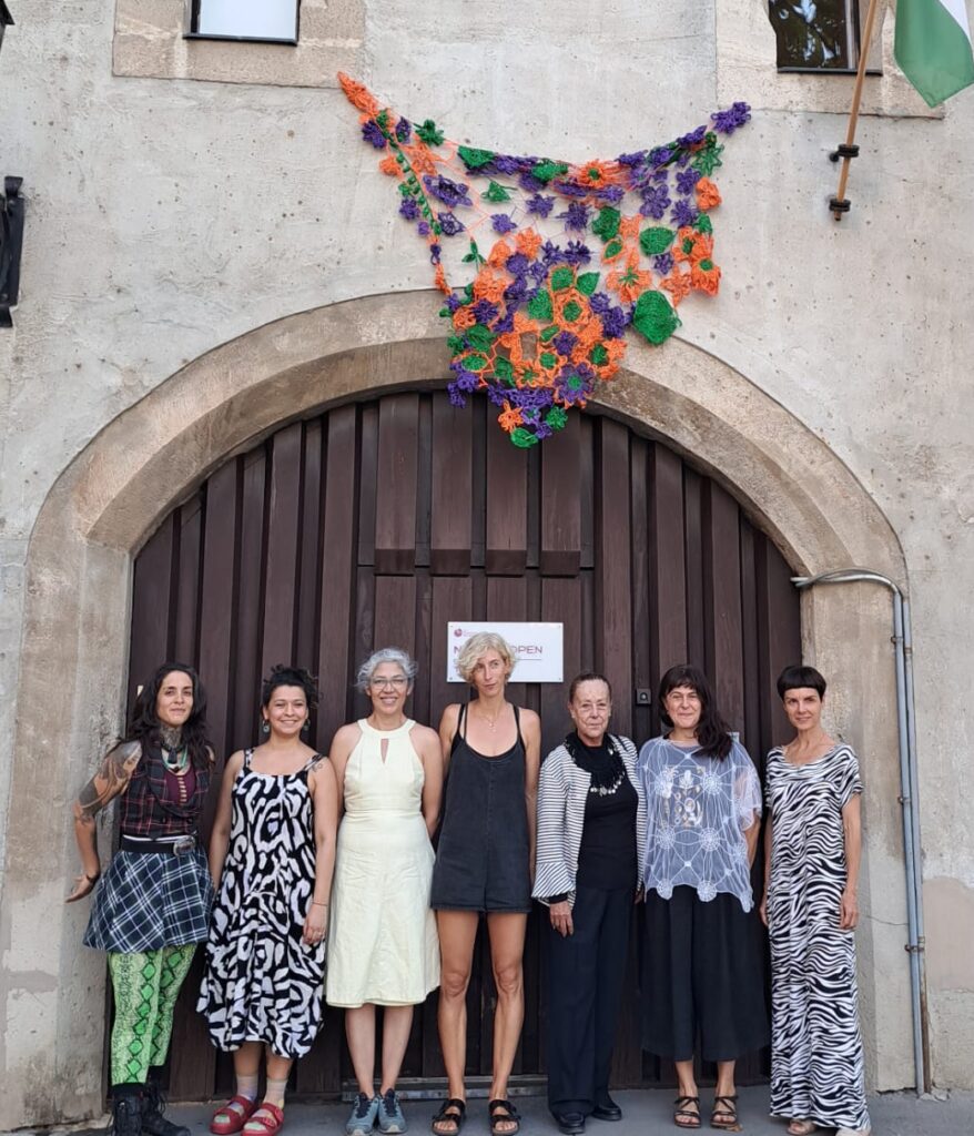 Al igual que cuando Karen Cordero nos invitó a participar en “(Re)generando narrativas e imaginarios. Mujeres en diálogo”, nos sentíamos unas terroristas invadiendo un espacio museal con nuestros bombardeos de estambre, ¿síndrome del impostor? No sé. Lo cierto es que en el tejer y destejer hemos ido descubriendo y tejiendo piezas vivas, modulares cuya aura es el continuum. En gerundio hemos comprendido que la fuerza de nuestras piezas está más que en el proceso, en la colectividad entramada en los hilos tejidos. El tiempo y los tiempos individuales con sus intimidades y resistencias anudadas. Las charlas, los llantos, los recuerdos, los presentes de las participantes que pronto también estarían narrados en húngaro. Anna Szász leyó esa densidad del tiempo –que evocamos en esos gestos textiles en los que profundiza Tania Pérez-Bustos– escrita a gancho en nuestras piezas; esa lectura la motivó a invitarnos.