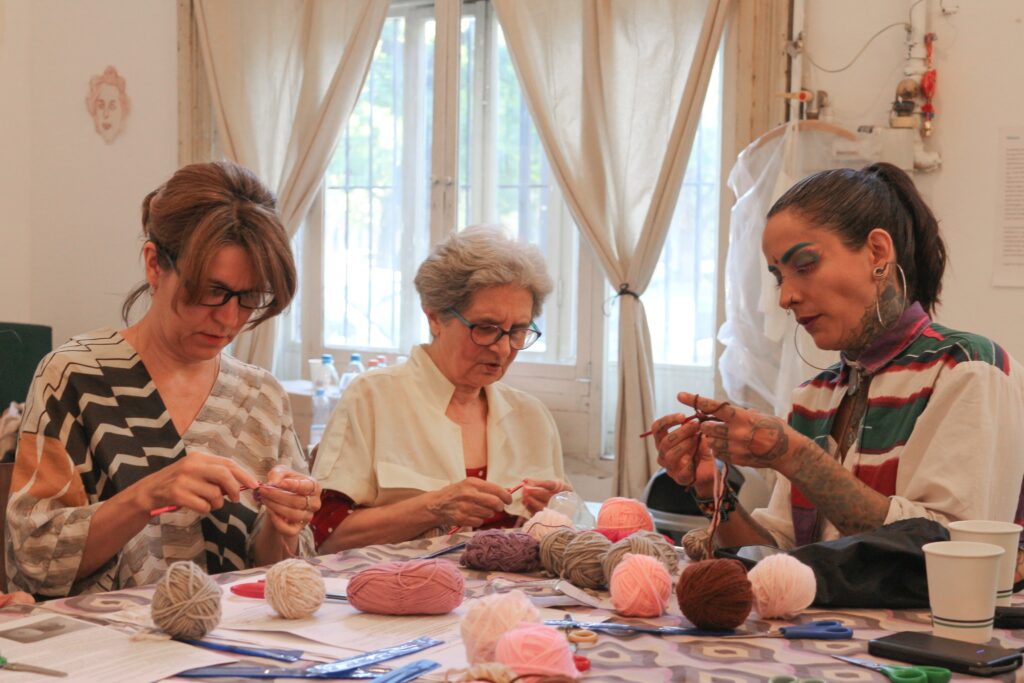 Algo me hizo dar un paso atrás, quizá el gusto por ver la energía de mis compinches expresarse en sus pasos, en su girar la vista para observar la arquitectura, en sus gestos desenfadados que exhibían su incredulidad de sabernos juntas caminando por la calle Hajós, para luego, traviesas, hacer un alto para tomar una foto de una de las esculturas que custodian la Operaház en el camino rumbo a Dajer, donde daríamos el primer taller de nuestra estancia en Budapest. Las observaba con sus outfits más que planeados, portados con orgullo; libros abiertos –como los de la canción de Gerardo Reyes– donde escribimos “tan bonito” el presente continuo de nuestras identidades, estados de ánimo, declaraciones individuales y el hilo creativo que nos une. Sin duda, como cantara Radio Futura, se nos ve la costura no sólo de “hilo rojo infinito”, sino de nuestras creencias como hacedoras de text-iles. La fe en las posibilidades creativas-colectivas-emotivas-atemporales-intelectuales-políticas del tejido. ¿Cómo llegamos aquí? Tal vez era el punto “natural” siguiente de este tejido. Así como a fuerza de la repetición de derechos y reveses (para las amantes de las agujas) y de cadenas y medios puntos (para las crocheteras), las tejedoras aprendemos a distinguir ese punto en el cual es mejor parar, continuar, cambiar de color, aumentar, corregir, desbaratar o cerrar; así, también, llegamos aquí. ¿Era la siguiente vuelta por tejer?