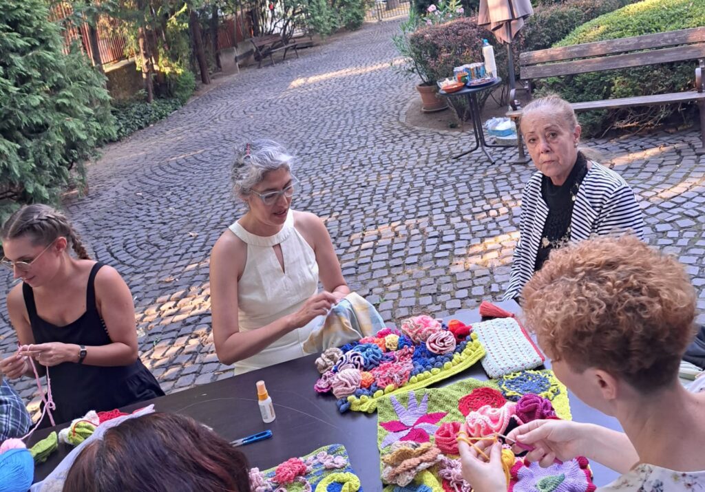 Así que el plan B estaba completo y listo para impartir el primer taller en nuestro segundo día en la ciudad, una que yo había visitado en 1994 como parte de mi experiencia mochilera juvenil y definitiva en mi educación sentimental. Apenas la recordaba; sin embargo, poco a poco se fue redibujando en mi memoria. A pesar de conservar la belleza arquitectónica que me había impactado en la década de los noventa, me entristeció observar que también había sucumbido al fenómeno de la turistificación que está transformando aceleradamente a las capitales del mundo en mercancías. Aun así, me maravilló, de nueva cuenta, la vista desde el Castillo de Buda, la monumentalidad del Parlamento y la museografía de su nuevo Museo Etnográfico, inaugurado apenas en 2022, que exhibe colecciones que datan del siglo XVII a la fecha. Asimismo, me impactó su visión histórica, lejos de cancelar su pasado comunista, está expuesto a las afueras de la ciudad en Memento Park, donde 42 de las estatuas derrumbadas en 1989 (incluidas las botas de Stalin, que son lo único que se conserva de aquel otrora monumento que medía un 25 metros de altura al sumar ocho metros de la estatua de bronce más una base de cuatro metros y una tribuna de 18 metros de ancho) es uno de los sitios más visitados después de los balnearios (termales), como Gellért, Rudas o Lukács, que han dado identidad a la ciudad sin importar el régimen. Lejos de sentirme, como en mi primera visita, en una película de espías estilo El tercer hombre, filmada en Viena, o sobre la ocupación nazi, como el film checo Los trenes rigorosamente vigilados, observé la occidentalización asentada en una vida cotidiana gentrificada bajo el mismo modelo capitalista: ya sea un flat white o una versión “local” del W Hotel o un museo de arte contemporáneo –el Ludwig– erigido en un distrito cuya arquitectura y urbanismo reflejan los ideales consumistas del siglo XXI. No me extrañó el Starbucks frente al río Danubio ni que hubiera un costo incluso para visitar la nave principal de la Catedral de San Esteban, tampoco la proliferación de restaurantes internacionales entremezclados con letreros de comida “auténtica” húngara para paladares cosmopolitas; lo que sí no me esperaba era observar un centro histórico tan ajeno a sus locales. Sin duda, el desplazamiento económico es otra lengua franca; por fortuna, al llegar a Dajer dejamos atrás las coincidencias transnacionales para descubrir la vida en húngaro de los húngaros que expresan en su hacer diario su resistencia ante el avance de la derecha, ¡qué si no es la curaduría de Anna, su fe en nosotras y la asistencia de tantas mujeres de diferentes edades aquel día para tejer chichis!